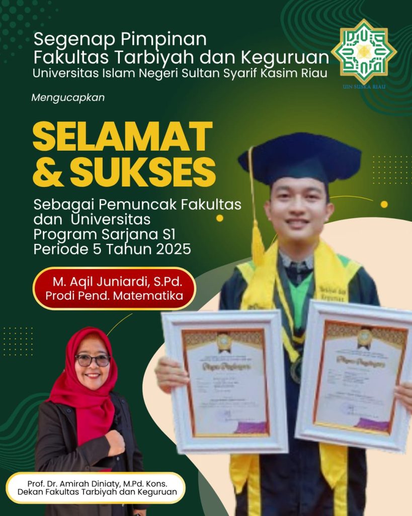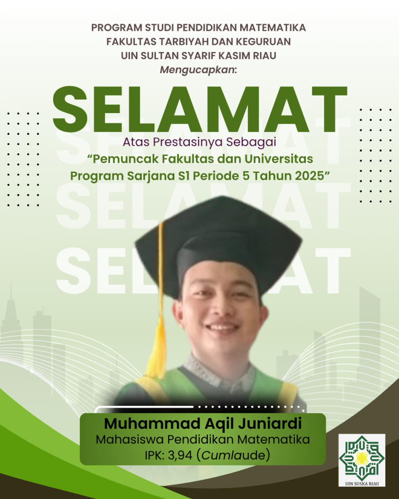 Selamat, Mahasiswa PMT Menjadi Pemuncak Fakultas dan Universitas pada Wisuda Program Sarjana S1 Periode 5 Tahun 2025 adminpmt 24 July 2025 Berita Utama, Info Mahasiswa Leave a comment 112 Views Related Articles Pemberitahuan Validasi Wisuda Periode 9 dan 10 Tahun 2025 4 weeks ago FGD Pendirian Magister Pendidikan Matematika: Langkah Awal Penguatan Akademik di FTK UIN Suska Riau 14 October 2025 Peran Matematika dalam Kebijakan Ekonomi Daerah: Prodi Pendidikan Matematika FTK UIN Suska Riau Hadirkan Kepala BPS Bengkalis sebagai Narasumber 9 October 2025 Share tweet