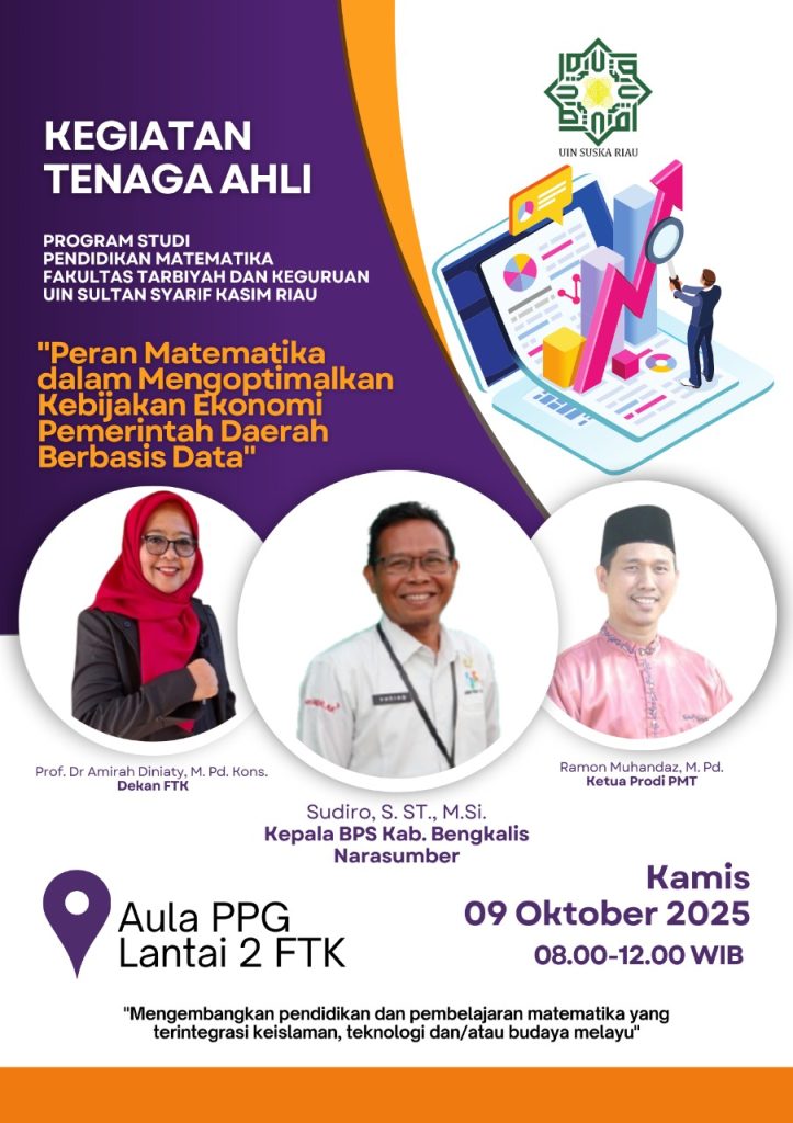 Coming Soon: Kegiatan Tenaga Ahli “Peran Matematika dalam Mengoptimalkan Kebijakan Ekonomi Pemerintah Daerah Berbasis Data” adminpmt 1 October 2025 Berita Utama, Info Mahasiswa Leave a comment 10 Views Related Articles Meneguhkan Komitmen Pengabdian dan Integritas: UIN Suska Riau Gelar Upacara Hari Amal Bhakti ke-80 Kementerian Agama 6 days ago UIN Suska Riau Berduka: Sivitas Akademika Kehilangan Sosok Pendidik dan Pemimpin, Dr. H. Jon Pamil, M.A. 3 weeks ago Menjamin Standar Akademik Calon Sarjana: FTK UIN Suska Riau Selenggarakan Ujian Komprehensif Mahasiswa 3 weeks ago Share tweet