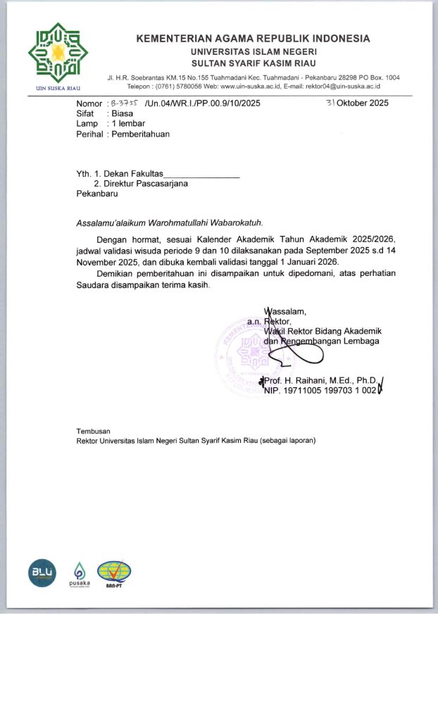 Pemberitahuan Validasi Wisuda Periode 9 dan 10 Tahun 2025 adminpmt 4 days ago Berita Utama, Info Mahasiswa Leave a comment 9 Views Related Articles FGD Pendirian Magister Pendidikan Matematika: Langkah Awal Penguatan Akademik di FTK UIN Suska Riau 3 weeks ago Peran Matematika dalam Kebijakan Ekonomi Daerah: Prodi Pendidikan Matematika FTK UIN Suska Riau Hadirkan Kepala BPS Bengkalis sebagai Narasumber 4 weeks ago Habibis Saleh Masuk Daftar Ilmuwan Top-Cited Scientists Indonesia tahun 2024 21 September 2025 Share tweet