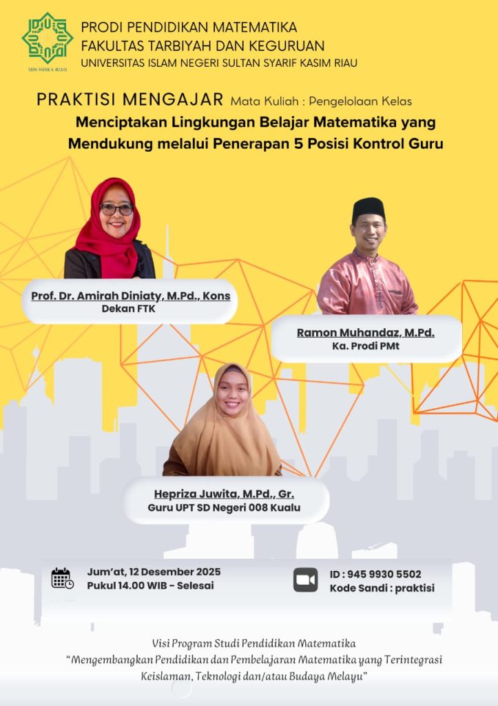 Coming Soon: Praktisi Mengajar Mata Kuliah Pengelolaan Kelas: “Menciptakan Lingkungan Belajar Matematika yang Mendukung melalui Penerapan 5 Posisi Kontrol Guru” adminpmt 1 December 2025 Berita Utama, Info Mahasiswa Leave a comment 14 Views Related Articles Meneguhkan Komitmen Pengabdian dan Integritas: UIN Suska Riau Gelar Upacara Hari Amal Bhakti ke-80 Kementerian Agama 5 days ago UIN Suska Riau Berduka: Sivitas Akademika Kehilangan Sosok Pendidik dan Pemimpin, Dr. H. Jon Pamil, M.A. 3 weeks ago Menjamin Standar Akademik Calon Sarjana: FTK UIN Suska Riau Selenggarakan Ujian Komprehensif Mahasiswa 3 weeks ago Share tweet