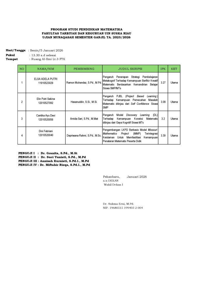 Ujian Munaqasyah 5 Januari 2026 adminpmt 3 weeks ago Berita Utama, Info Mahasiswa Leave a comment 7 Views Related Articles Meneguhkan Komitmen Pengabdian dan Integritas: UIN Suska Riau Gelar Upacara Hari Amal Bhakti ke-80 Kementerian Agama 2 weeks ago Ujian Munaqasyah 12 Januari 2026 2 weeks ago Ujian Munaqasyah 8 Januari 2026 2 weeks ago Share tweet