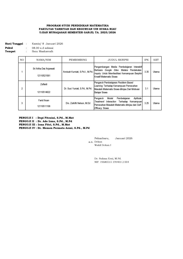 Ujian Munaqasyah 8 Januari 2026 adminpmt 2 weeks ago Berita Utama, Info Mahasiswa Leave a comment 8 Views Related Articles Meneguhkan Komitmen Pengabdian dan Integritas: UIN Suska Riau Gelar Upacara Hari Amal Bhakti ke-80 Kementerian Agama 2 weeks ago Ujian Munaqasyah 12 Januari 2026 2 weeks ago Ujian Munaqasyah 5 Januari 2026 3 weeks ago Share tweet