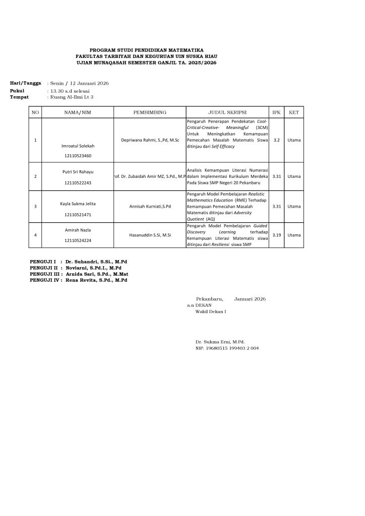 Ujian Munaqasyah 12 Januari 2026 adminpmt 2 weeks ago Berita Utama, Info Mahasiswa Leave a comment 6 Views Related Articles Meneguhkan Komitmen Pengabdian dan Integritas: UIN Suska Riau Gelar Upacara Hari Amal Bhakti ke-80 Kementerian Agama 2 weeks ago Ujian Munaqasyah 8 Januari 2026 2 weeks ago Ujian Munaqasyah 5 Januari 2026 3 weeks ago Share tweet