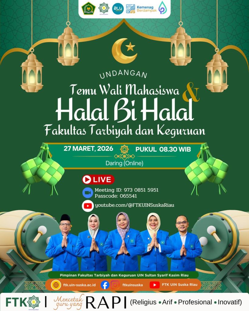 Fakultas Tarbiyah dan Keguruan (FTK) UIN Sultan Syarif Kasim Riau menyelenggarakan kegiatan Temu Wali Mahasiswa dan Halal Bi Halal dalam rangka mempererat silaturahmi pasca-Idulfitri 1447 H. Kegiatan ini dilaksanakan pada Jumat, 27 Maret 2026 pukul 08.30 WIB secara daring melalui platform Zoom Meeting.