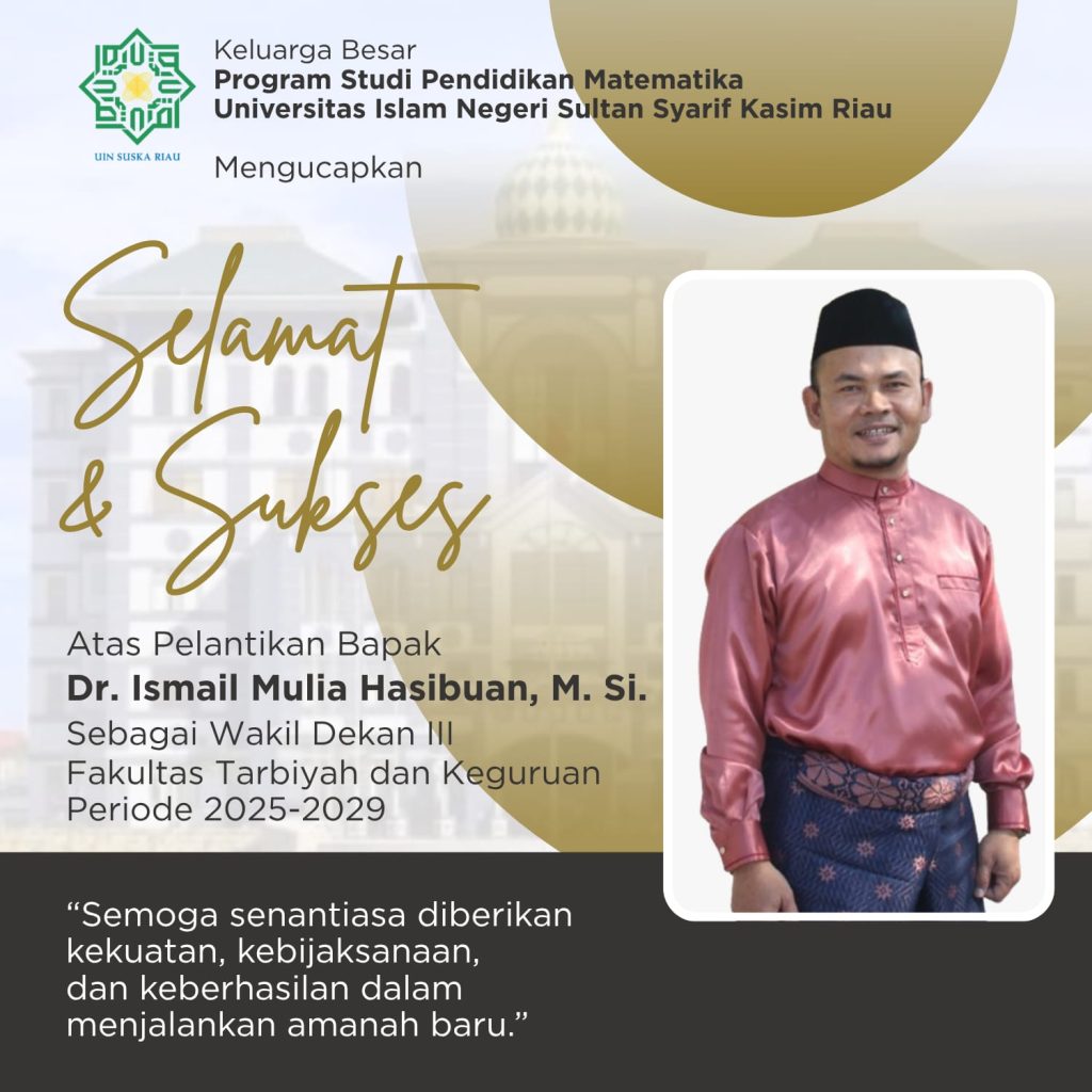 Pekanbaru – Kabar membanggakan datang dari Fakultas Tarbiyah dan Keguruan (FTK) UIN Sultan Syarif Kasim Riau. Dr. Ismail Mulia Hasibuan, M.Si. resmi dilantik sebagai Wakil Dekan III untuk periode 2025–2029. Pelantikan ini disambut hangat oleh civitas akademika, khususnya keluarga besar Program Studi Pendidikan Matematika.